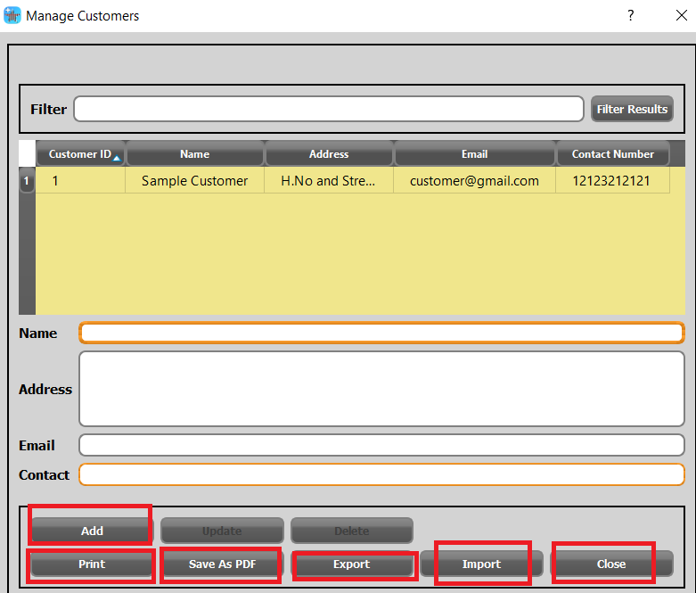 CUSTOMERS: If you want to associate a sale with some customer, then you would have to select the customer by pressing this button. It will show you customers dialog, where you can add, edit, or select existing customers from the list. If pressed once, this button will remain in that state representing the customer selection. You would have to press it again to clear the current customer selection.