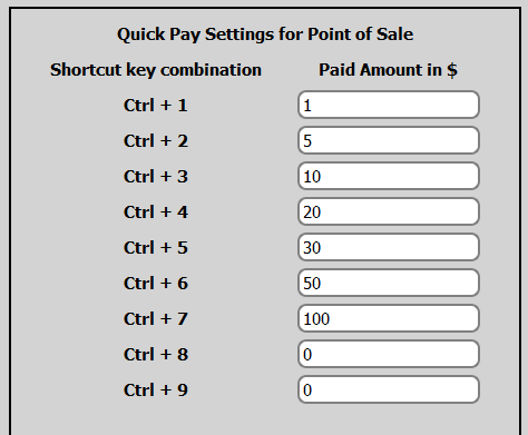 Consider the settings shown in the above figure. Ctrl+3 key combination is associated with $10. If you press Ctrl+3 (Pressing Ctrl Key and 3 Key at the same time) on POS screen, $10 will be entered in the PAID box and sale will be closed automatically. This significantly reduces the number of keys you need to press for closing a sale.
