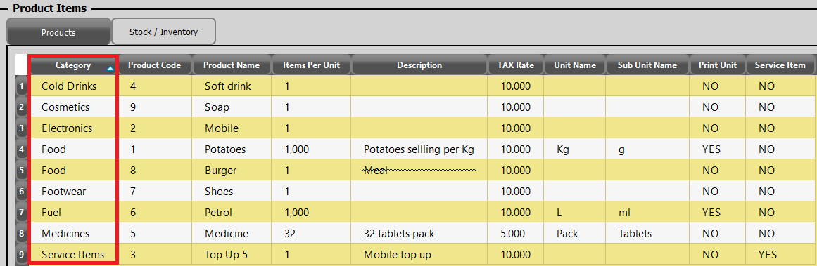 For service item column, enter y (short of Yes), or n (short for No), and same is the case for print unit name column if you want to print the unit name of the product on receipts.
