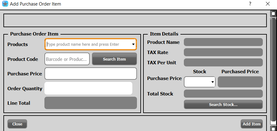 In order to add item to purchase order, you would have to click on the “Add Item” button. On pressing this button following dialog will be shown: