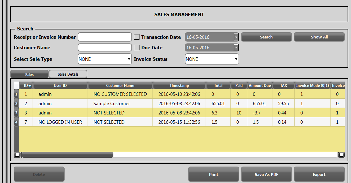 This module allows printing, or exporting to CSV file all the sales transactions. You can also perform searching and sorting on these transactions. You also have an option to delete any transactions from the system.