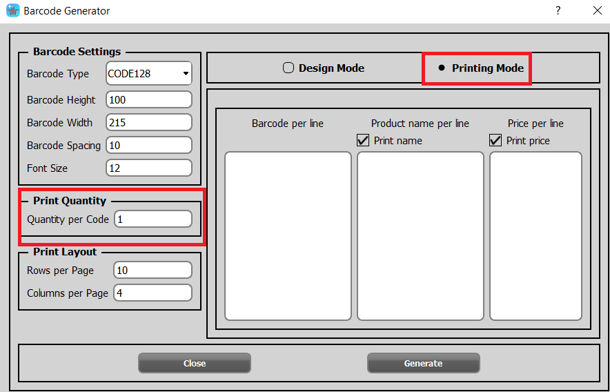Quantity: Quantity means the number of barcodes per value that you want to generate. If there are two values provided in the box “Barcode per line”, and the quantity is set to 10, then in total 20 barcodes will be generated and printed (10 per code). This feature is useful when you want to print papers only with one barcode.