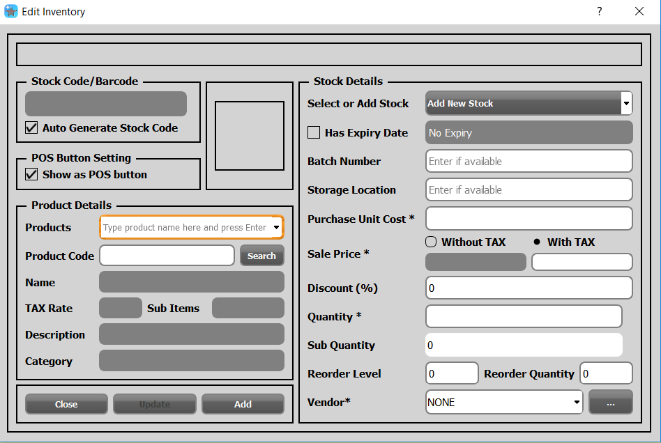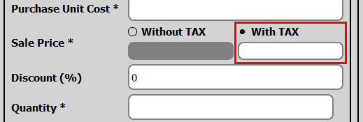 Sale Price: Sales price field has two radio boxes, without Tax and with Tax. This allows entering the sale price with or without sales tax, and system will calculate the other price automatically. You would have to click on the respective radio box (with or without TAX) in order to enable the sale price field underneath.