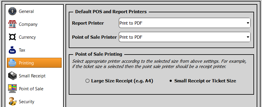 Point of Sale Printing: These settings determines whether you want to print large receipts or invoices (e.g. A4 size), or small receipts (tickets). If you have selected large size, then point of sale printer should be able to print large size receipts. Similarly if you have selected small receipts, then point of sale printer should be able to print receipts or tickets.