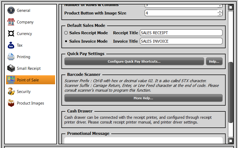 Point of Sale Buttons: These are the buttons with pictures shown on the right side of the POS screen. You can add products to sale by simply pressing these buttons. If you do not want to show these buttons on the POS screen then uncheck the box labeled as “Show POS Buttons Tab”. This will hide the whole tab.