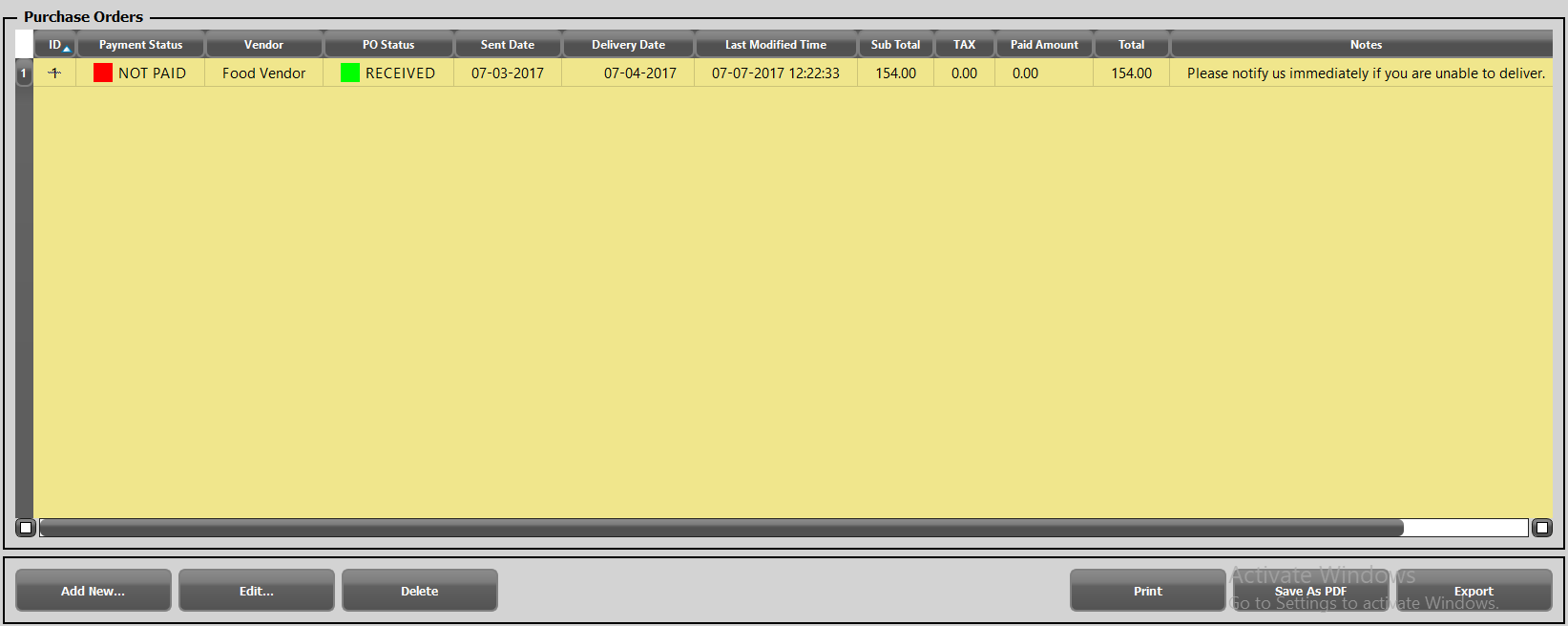 In order to create a new purchase order or edit an existing purchase order, please click on any row in the available list. Following Add or Edit purchase order screen will be shown: