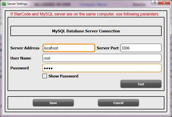After successful installation of MySQL server and configuration, the next step is to configure StarCode in Network Mode to make use of this server. Start StarCode. Make sure you are in Network mode. Current selected mode will be shown in the top right corner of the application window. If it is the first time then it would not be able to connect to the server. Now launch MySQL Server Settings dialog from Tools menu. If you are running StarCode in Network mode on the same computer where MySQL server is installed, then following configuration will be fine.