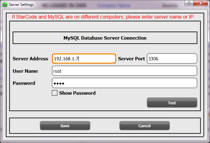 Now launch MySQL Server Settings dialog from StarCode Tools menu, and fill in following parameters. You will need to provide the IP address of server computer.